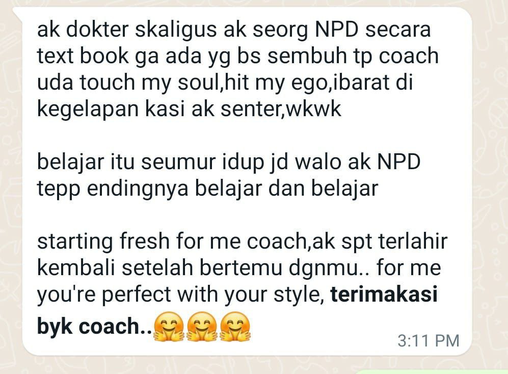 Testimoni dari klien yang berprofesi sebagai dokter dan juga seorang NPD (Narcissistic Personality Disorder). Saya kagum dengan semangat nya untuk menjadi lebih baik dan terus bertumbuh. Dia terus coaching secara personal dan juga mendengarkan audio coaching.